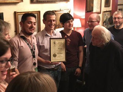 The branch presented the certificate to the pub and its staff on 18th April. While there we sampled some of their beers which that evening included some of the award winning London beers from the London Drinker Beer Festival. The Harp is widely known for its great selection of well-kept beers and ciders including local London beers, and is a participant in the CAMRA LocAle scheme.